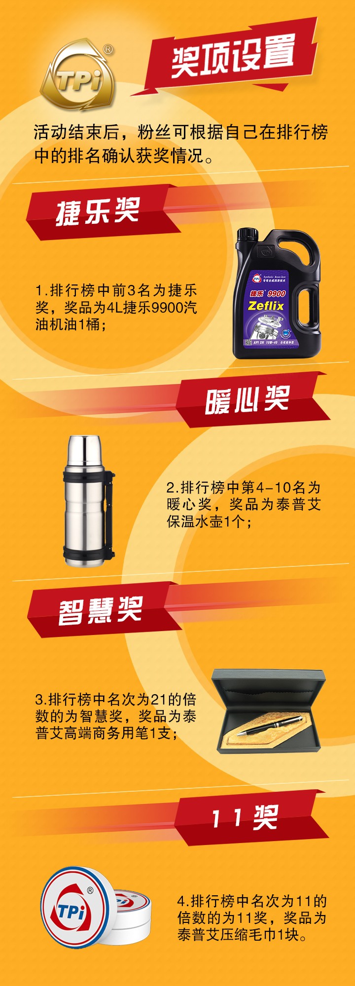 2.中獎人需在11.14-11.16日間將【獎項名+微信昵稱+姓名+電話+郵寄地址】以信息形式發(fā)送至泰普艾潤滑油官方微信,逾期作廢;