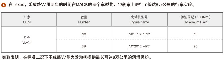 在美國(guó)德克薩斯州,樂威路V7用兩年時(shí)間在“馬克(MACK)”兩個(gè)車型的12輛車上進(jìn)行了長(zhǎng)達(dá)8萬(wàn)公里的行車實(shí)驗(yàn),證明了在標(biāo)準(zhǔn)工況下樂威路V7 可達(dá)70000KM的超長(zhǎng)換油周期,是混合車隊(duì)的理想選擇。